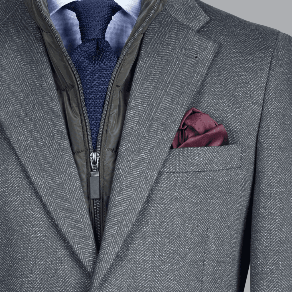 Pañuelo de Bolsillo en Tonos Vino o Burdeos: Como se observa en la imagen, este detalle añade un foco de color sofisticado que eleva instantáneamente el look.